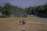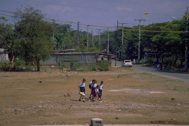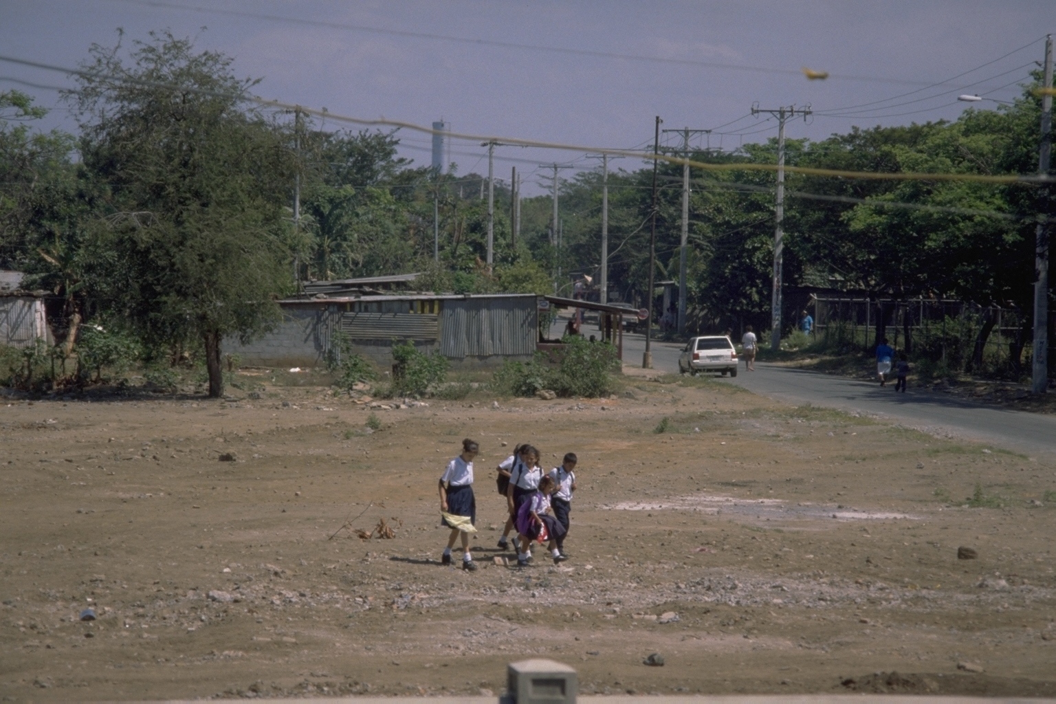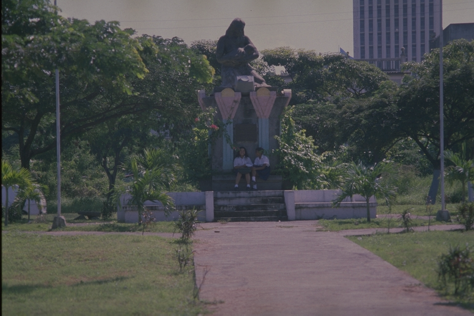 マナグアの街中で。像の由来は不明だけど、座り込んでる女の子たちとの対象が面白くて撮影。