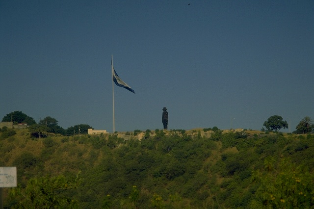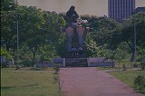 Managuaの丘の上に立つ巨大な国旗と、、、立像。