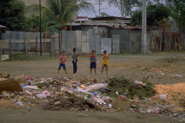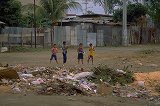 街中のゴミ捨て場の近所で遊ぶ子供たち。
